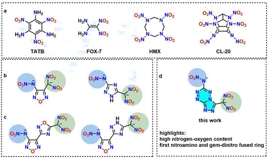 The design and synthesis of energetic compounds with both enhanced energy and safety are highly desired in the field of energetic materials. Due to the existence of the energy and safety contradiction, higher energy usually leads to lower safety. The energetic compounds involving a single explosophoric group always result in only one of the energy or safety properties being improved. For instance, although increased detonation performances were obtained for the nitroamine benchmark explosives such as 1,3,5,7-tetranitro-1,3,5,7-tetrazoctane (HMX) or hexanitrohexaazaisowurtzitane (CL-20), the large number of nitroamine groups in the structure resulted in a decreased safety with sensitivities located in the sensitive range (Figure 1a). The coordinative combination of different explosophoric groups is beneficial for achieving enhanced comprehensive properties for energetic compounds; the representative examples, such as 2,4,6-triamino-1,3,5-trinitrobenzene (TATB) and 1,1-diamino-2,2-dinitroethene (FOX-7), are insensitive explosives due to the existence of C-NH2 and C-NO2 groups [,,]. Demonstrating the coordinative combination of an explosophoric group is an effective way to tune the structures of energetic compounds to gain desired properties [,].