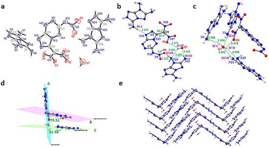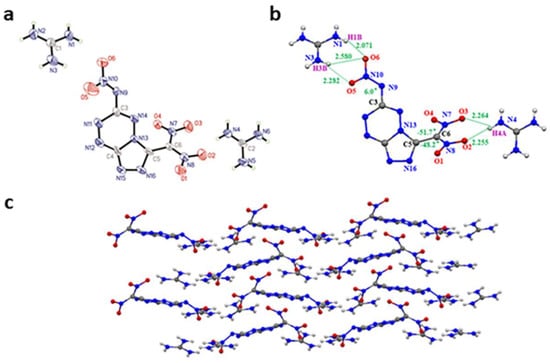 Crystals of (3-(dinitromethanidyl)-[1,2,4]triazolo[4,3-b][1,2,4,5]tetrazin-6-yl)(nitro)amide guanidine salt (3) (CCDC 2204894) were obtained from water. Compound 3 belongs to the monoclinic crystal system with space group Cc (Z = 4) symmetry with a crystal density of 1.629 g cm−3 (296 K). The X-ray structure and crystal parameters of compound 3 are shown in Figure 2a and Table S1. From Figure 2b, the torsion angle N3-C9-C10-O5 = 6° shows acceptable planarity of the nitramine with the fused ring. The dinitromethyl group and the fused heterocyclic ring form the torsion angle N13-C5-C6-N7 = −51.7° and N16-C5-C6-N8 = −48.2°. Also, the guanidine cations form a large number of intramolecular O⋯H hydrogen bonds with the geminal dinitro and nitroamine groups. The distances of O⋯H are in the range of 2.071–2.580 Å (Figure 2b). A mixed stacking was observed in the packing diagram of 3 (Figure 2c).