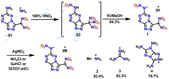 The synthetic route is shown in Scheme 1. The starting material, compound S1, was obtained using a special aminohydrazone cyclization strategy based on our previous research []. Then, the further nitration of S1 in 100% nitric acid creates the fused triazole–tetrazine nitroform compound S2. Pure S2 can be isolated by column chromatography; S2 is stable in solvent but will decompose fast in a solid state. The dipotassium salt 1 was readily prepared in good yield by reacting S2 with potassium iodide in methanol. However, if the potassium iodide was replaced by hydroxylamine hydrochloride or potassium hydroxide, the reduction of nitroform proceeded incompletely due to the weak reducibility of hydroxylamine. The attempt to prepare the hydrazinium salt by reacting diluted hydrazine hydrate, which has a strong reducing ability, resulted in a significant decomposition of S2. Subsequently, the diammonium salt 2 (yield: 83.2%), diguanidine salt 3 (yield: 82.1%) and di-TATOT salt 4 (yield: 79.5%) were prepared through a metathesis reaction using silver salts with corresponding chloride salt.