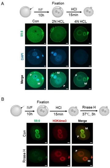 Optimization of R-loop immunofluorescence. (A) Maximum intensity projection of z-stack images of 10 hpi zygotes. Immunofluorescence detection of the R-loop using S9.6 antibodies. DNA denaturation steps were used for antigen retrieval using the 2N or 4N HCl for 15 min. Images show the R-loop (S9.6 antibodies, green), DNA (DAPI, blue), and merged image of these two channels (merge). (B) Maximum intensity z-stack projection images of 10 hpi zygotes. Immunofluorescence detection of the R-loop (S9.6 antibodies, green), histone H3K4me3 (red), DNA (DAPI, blue), and merged images of these three channels (merge) in zygotes that were mock-treated or treated with 80 IU/mL of RNase H for 3 h at 37 °C. M, maternal pronucleus; P, paternal pronucleus. All scale bars = 10 µM.