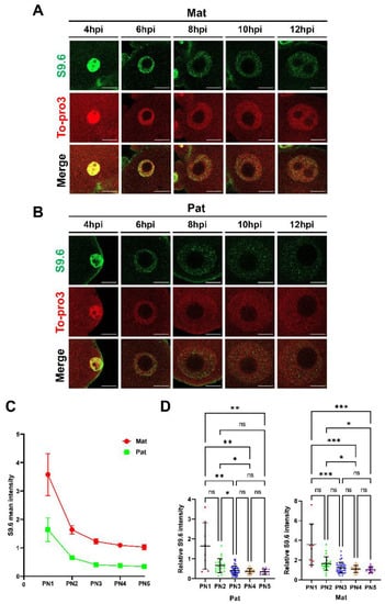 Next, the R-loop dynamics throughout the PN1-5 of the one-cell embryos were analyzed in detail (Figure 3). The analysis revealed that R-loops were detected from the start of pronucleus formation to telophase at the end of the one-cell stage (Figure 2), and the relative mean intensity of the S9.6 signals was higher in the maternal pronucleus than in the paternal pronucleus throughout PN1-5 (Figure 3C). Interestingly, the R-loop levels decreased as pronucleus maturation proceeded in both pronuclei (Figure 3D), in which the R-loop level was mostly weaker at the point of PN1 to PN2 transition (Figure 3).
