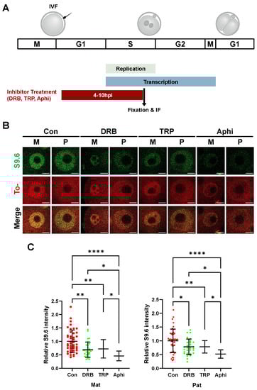 To inhibit DNA replication and transcription in 1-cell stage zygotes, zygotes were transferred to KSOM containing 100 μM DRB (D1916, Sigma, Livonia, MI, USA), 1 μM triptolide (T3652, Sigma, Livonia, MI, USA), or 2 μg/mL aphidicolin (84958, Sigma, Livonia, MI, USA) between 4 hpi and 10 hpi. To induce DNA damage, zygotes were transferred to KSOM containing 5 µM cisplatin (P4394, Sigma, Livonia, MI, USA) and 200 nM doxorubicin (D1515, Sigma, Livonia, MI, USA) at 4 hpi and 12 hpi. After several washing steps, inhibitor-treated zygotes were fixed with 4% PFA and subjected to immunofluorescence analysis. Control embryos were cultured in inhibitor-free KSOM medium containing the appropriate amount of dimethyl sulfoxide (DMSO), a solvent used for the preparation of inhibitors.