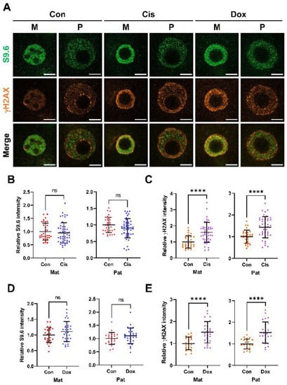 Increased γH2AX levels did not affect the R-loop levels. (A) Single confocal optical section images of the maternal (M) and paternal (P) pronuclei from representative embryos. Zygotes were mock-treated (Con) and treated with cisplatin (Cis) and doxorubicin (Dox) from 4 hpi to 12 hpi (S-G2 phase). Immunofluorescence detection of the R-loop (S9.6 antibodies, green), γH2AX (yellow), and merged image of these two channels (merged). M, paternal pronucleus; P, paternal pronucleus. All scale bars = 10 µM. (B) Quantification of relative S9.6 signal intensities in each maternal (Mat, left) and paternal (Pat, right) pronuclei. Con; n = 33, Cis; n = 48. (C) Quantification of relative γH2AX signal intensities in maternal (Mat, left) and paternal (Pat, right) pronuclei. Con; n = 30, Cis; n = 43. (D) Quantification of relative S9.6 signal intensities in each maternal (Mat, left) and paternal (Pat, right) pronuclei. Con; n = 26, Dox; n = 48. (E) Quantification of relative γH2AX signal intensities in maternal (Mat, left) and paternal (Pat, right) pronuclei. Con; n = 23, Cis; n = 28. This experiment was independently replicated three times. Statistical analysis was performed using an unpaired t-test. Error bars represent standard deviation. p-value: **** p < 0.0001; center values, mean; ns, not significant.