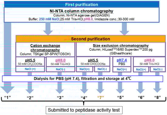 Overall strategy and the flow chart for systematic experiments. Ni-NTA affinity chromatography was performed for all samples as the first purification step. The sample obtained by Ni-NTA affinity chromatography is designated as route “1.” For the second purification step, a cation exchange or size exclusion column chromatography was employed, in which the sample was purified under various conditions by changing pH and with or without NaCl. All samples were dialyzed against PBS (pH 7.4) twice and filtered for sterilization. Finally, the samples were subjected to a peptidase activity test.