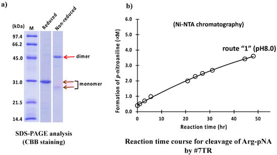 A kinetic study was carried out using #7TR purified by route”5” (pH 7.4), where #7TR was kept at 10 μM and concentrations of the substrate R-pNA were varied from 125 to 600 μM. The obtained result of the Hanes-Woolf plot is presented in Figure 8a. It shows a linear relationship between [S] vs [S]/V. Thus, #7TR obeys the Michaelis-Menten equation as an enzymatic reaction. The values of kcat, Km, and kcat/Km were 2.5 × 10−3 min−1, 1.05 × 10−4 M, and 2.38 × 10 min−1M−1, respectively. These values are comparable with those of Durova et al. [].