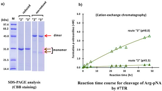SDS-PAGE and peptidase activity by route “2” and “3”. (a) SDS-PAGE analysis. Bands were visualized by CBB staining. Under both reduced and non-reduced conditions, bands such as ~30 kDa, a faint ~26 kDa, and the visible~ 46 kDa observed in Figure 2a were detected. #7TR was highly purified. (b) peptidase activity. The reaction conditions were the same as those performed in Figure 2b. The catalytic activity of #7TR purified at pH 8.0 by route “3” showed moderate activity (open triangle), as observed in Figure 2b. In contrast, #7TR purified at pH 5.5 by route “2” was very low (solid triangle).
