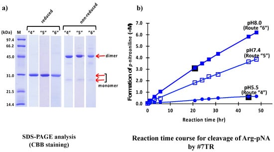 #7TR purified by routes “4”, “5,” and “6”. (a) SDS-PAGE analysis. Bands were visualized by CBB staining. Under both reduced and non-reduced conditions, bands such as ~30 kDa, a faint ~26 kDa, and the visible ~46 kDa as those observed in Figure 2a and Figure 3a were detected for three preparation routes. In all cases, #7TR was highly purified. (b) peptidase activity. The reaction conditions were the same as those in Figure 2b and Figure 3b. The catalytic activity of #7TR purified route “4” at pH 5.5 (solid circle), route “5” at pH 7.4 (open square), and “6 at pH 8.0 (solid square) was examined. The activity of route “6” at pH 8.0 was very high, followed by route “5” at pH 7.4 showing the moderate activity. That by route “4” at pH 5.5 was very low.
