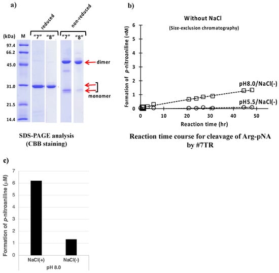 The reaction time courses for each pH are shown in Figure 5a, where pH was varied from 5.0 to 9.0. The catalytic activity to cleave the R-pNA substrate was low at pH 5.0 and 6.0, whereas it was higher at pH 7.0, 8.0, and 9.0. In a basic condition, the catalytic activity increased in a pH-dependent manner. In contrast, under an acidic condition, the catalytic activity was hugely suppressed. In Figure 5b, the relation between pH and the concentration of produced p-nitroaniline at 27 h of incubation was presented for easy understanding. The substrate R-pNA was gradually cleaved over pH 7.0. As the isoelectric point of #7TR is 6.52, the purification pH, which is larger than the isoelectric point, might be important for revealing the intrinsic catalytic function.