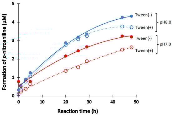 Tween-20 is a surfactant is often used in immunoreaction experiments. Thus, the effect of Tween-20 on the catalytic activity of #7TR (6.8 μM) purified by route “5” was investigated under the reaction conditions at pH 7.0 and 8.0. Figure 7 presents the results. In the case of pH 7.0, it is clear that the Tween-20 (2.5%) lowered the catalytic activity. A similar effect was observed at pH 8.0 after more than 40 h of incubation.