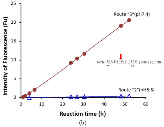 Figure 10b displays the reaction time course of H34 purified with purification (II) (pH 5.5). In this case, the concentration of product pNA was gradually increased up to 20 h of incubation in a time-dependent manner, and then it reached the plateau. Note that the cleavage of the FRET-PD1 substrate was considerably suppressed using #7TR prepared with pH 5.5.
