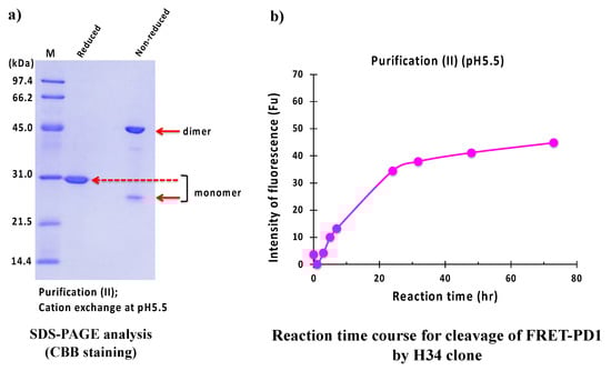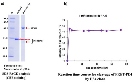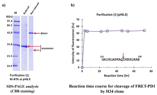 The result of the SDS-PAGE analysis is shown in Figure 9a, where a monomer band under reduced conditions appeared at approximately 29 kDa. The band at around 45 kDa and a faint band at around 25 kDa under non-reduced conditions corresponded to the dimer and monomer of the H34 light chain, respectively. The monomer band was very faint, while the dimer was visible, which suggests that the dimer is dominant in the solution. Figure 9b shows the reaction time course of H34 purified with purification (I) (pH 8.0). The FRET-PD1 substrate was rapidly hydrolyzed within 2 h of incubation, indicating that #7TR showed high catalytic activity. The cleavage peptide bond was between Gln132 and Ile133 of the PD-1 peptide [].