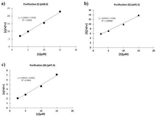 To investigate what caused these different catalytic activities, kinetic studies were performed using the synthetic substrate FRET-PD1. For each case, Hanes–Woolf plots ([S]/v vs. [S]) were taken. First, the plots for the H34 sample purified at a pH of 8.0 (purification (I)) is shown in Figure 13a, where a good linear relationship was observed, indicating that the reaction obeyed the Michaelis-Menten equation and the reaction was enzymatic. The kcat and Km values were 5.5 × 10−2 min−1 and 3.24 × 10−6 M, respectively. The kcat/Km value (catalytic efficiency) was 1.7 × 104 min−1 M−1. The kcat was higher than that of the sample purified at a pH of 5.5 (purification (II)) by a factor of 22.9-fold, which is described in the following. Second, the H34 sample purified at a pH of 5.5 (purification (II)) was examined. As shown in Figure 13b, a good linear relationship was observed in this case, too. The kcat, Km, and kcat/Km values were 5.8 × 10−3 min−1, 7.87 × 10−6 M, and 7.4 × 102 min−1M−1, respectively. Third, Figure 13c shows the H34 sample purified at a pH of 7.4 (purification (III)). The kcat and Km values were 1.8 × 10−1 min−1 and 3.07 × 10−6 M, respectively. The kcat/Km value was 1.7 × 104 min−1M−1, which was higher than that of the sample of purification (II) by a factor of 79.7-fold. Thus, the sample purified in a basic condition exhibited an intrinsic catalytic ability, whereas the catalytic function was suppressed when purified in an acidic condition.