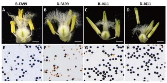 Phenotypic characteristics of FA99 and J411 in different fertility conditions. (A,E) B-FA99 (FA99 in the fertile condition); (B,F) D-FA99 (FA99 in the sterile condition); (C,G) B-J411 (J411 in the fertile condition); (D,H) D-J411 (J411 in the sterile condition); (A–D) Floret at the trinucleate stage; (E–H) I2-KI staining of pollen grains. Scale bars = 500 µm (A–D); 100 µm (E–H).