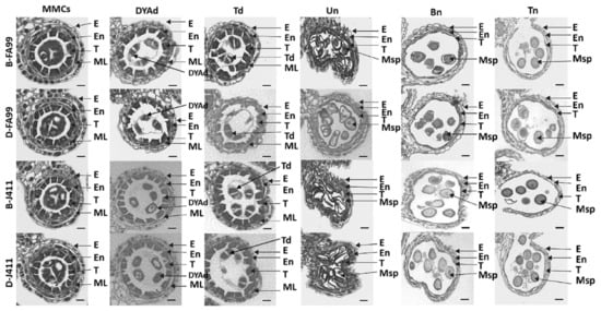 The developmental stages of microspores were identified using the acetic acid magenta solution. Florets from D-FA99, B-FA99, D-J411 and B-J411 at the Tn were carefully removed with tweezers and observed under a Motic K400 stereomicroscope (Hong Kong, China). Mature pollen grains from anthers were stained with I2-KI solution to determine fertility and captured using an Olympus SZX10 (Tokyo, Japan). For paraffin section observation, anthers at the MMCs, DYAd, Td, Eun, Lun, Bn and Tn were fixed in FAA at 4 °C. After ethanol gradient dehydration and clearing in xylene, anthers of different developmental stages were embedded in paraffin. The 8 µm transverse sections were stained with 0.2% toluidine blue and images were taken by Axio Imager A2 (Zeiss, Oberkochen, Germany) [].