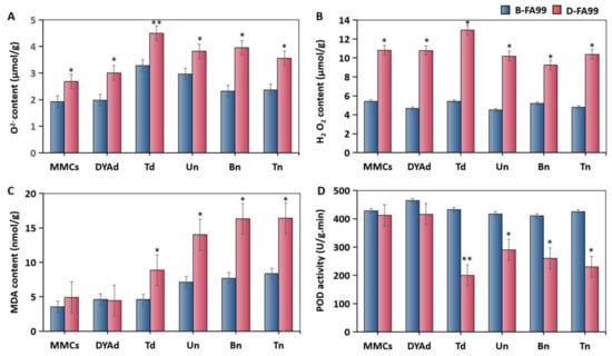 Analysis of FA99-related physiological indexes in different fertility environments. (A) O2− contents; (B) H2O2 contents; (C) MDA contents; (D) POD activity. MMCs: microspore mother cell stage; DYAd: dyad stage; Td: tetrad stage; Un: uninucleate stage; Bn: binucleate stage; Tn: trinucleate stage. Students’ t test * p < 0.05, ** p < 0.01. Each value represents the mean ± SD (n = 3).