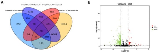 Analysis of DEGs between the samples. (A) Venn diagram of all DEGs; (B) Differences in the abundance of genes.