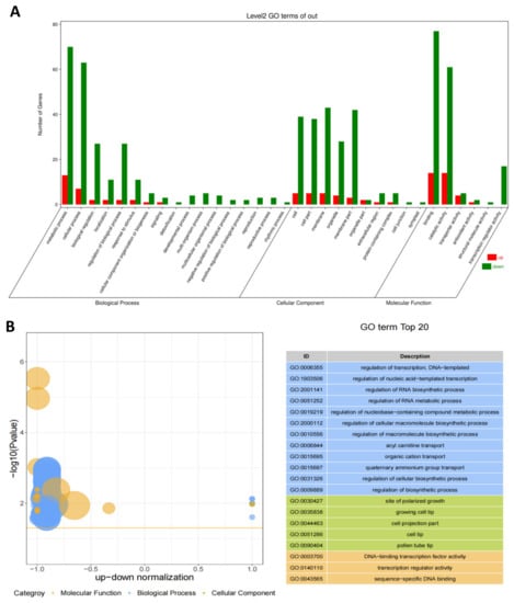 To further clarify the functional genes, KOG classifications waweres employed. In total, 93 successfully annotated DEGs can be divided into three categories according to the 25 functional categories of KOG. The results showed that the DEGs were involved in processes including “transcription”, “posttranslational modification, protein turnover, chaperones” and “carbohydrate transport and metabolism”. These processes may play important roles in the anther development and differentiation in FA99 (Figure S1). According to GO function classification analysis, the DEGs annotated were classified into 33 functional groups in three principal categories comprising “biological process”, “cellular component” and “molecular function”. In the biological process, the DEGs were primarily associated with the metabolic process (GO: 0008152), cellular process (GO: 0009987), biological regulation (GO: 0065007) and regulation of biological process (GO: 0050789). The main cellular component contained 10 GO terms. Most of the DEGs were primarily concerned with cell (GO: 0005623), cell part (GO: 0044464), membrane (GO: 0016020), organelle (GO: 0043226) and membrane part (GO: 0044425). Binding (GO: 0005488) and catalytic activity (GO: 0003824) were dominant in the category of molecular function (Figure 5A). In addition, the top 20 enriched GO terms were rich in the “biological process” term (Figure 5B). We also found there were more downregulated DEGs than upregulated DEGs in FA99 based on the Z-score bubble diagram, and the downregulated DEGs significantly enriched in the regulation of transcription, DNA-templated (GO:0006355), site of polarized growth (GO:0030427), DNA–binding transcription factor activity (GO:0003700), respectively from “biological process”, “cellular component” and “molecular function” (Figure 5B). The results showed that the DEGs annotated in GO enrichment analysis may provide valuable insight for studying male sterility in FA99.