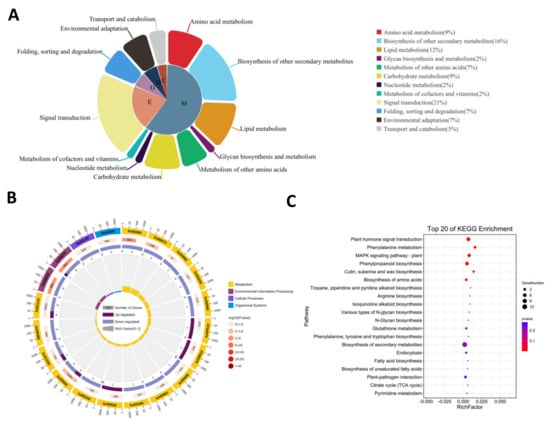 Primary and secondary classification (A) and the top 20 significantly enriched pathways based on KEGG (B,C). C: cellular processes; O: organismal systems; G: genetic information processing; E: environmental information processing; M: metabolism.