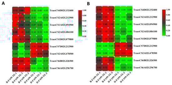 In order to identify the functions of DEGs, KEGG pathways enrichment analysis was performed. The DEGs in the FA99 were assigned to 37 pathways in the KEGG database, where five enrichment parts were identified, including “cellular processes”, “environmental information processing”, “genetic information processing”, “metabolism” and “organismal systems”. The most DEGs were associated with “metabolism” comprising “amino acid metabolism”, “biosynthesis of other secondary metabolites”, “lipid metabolism”, “glycan biosynthesis and metabolism”, “metabolism of other amino acids”, “carbohydrate metabolism”, “nucleotide metabolism” and “metabolism of cofactors and vitamins” (Figure 6A). Among the top 20 pathways, many pathways were related to “phenylalanine metabolism”, “phenylpropanoid biosynthesis”, “cutin, suberine and wax biosynthesis”, “phenylalanine, tyrosine and tryptophan biosynthesis” and “citrate cycle (TCA cycle)” based on p-value < 0.05 (Figure 6B,C). Previous studies have reported that genes and enzymes related to “phenylalanine metabolism”, “phenylpropanoid biosynthesis” and “phenylalanine, tyrosine and tryptophan biosynthesis” have an important role in male sterility [,,]. Hierarchical clustering analysis was employed to study the nine DEGs in the three pathways. Apart from the genes encoding peroxidase (TraesCS7D02G212900) and β-glucosidase (TraesCS2A02G478500), seven DEGs including the genes encoding tyrosine aminotransferase (TraesCS4D02G153400), phenylalanine ammonia-lyase (TraesCS2A02G212900, TraesCS1A02G094900), peroxidase (TraesCS2A02G084100, TraesCS1D02G079800) and peroxygenase (TraesCS6B02G326500, TraesCS6A02G296700) in the major pathways were downregulated in the D-FA99 compared with B-FA99 (Figure 7A). The results showed these genes may be related to male sterility in FA99.