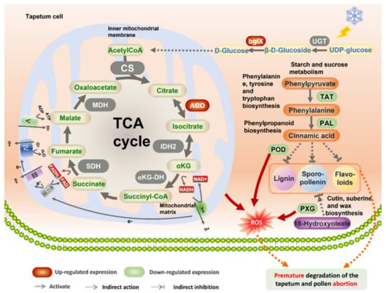 According to the KEGG cluster analysis of DEGs, we analyzed the DEGs in the five important metabolic pathways (starch and sucrose metabolism, TCA cycle, phenylalanine, tyrosine and tryptophan biosynthesis, phenylpropanoid biosynthesis and cutin, suberine and wax biosynthesis), as well as considering physiological index determination, cytological observation and previous studies, we propose a possible transcriptome-mediated male sterility network in FA99 (Figure 8). Previous studies have shown that defects in the TCA cycle may disturb the electron transport chain and thereby lead to producing excessive amounts of ROS [,]. Moreover, excessive amounts of ROS may induce changes in mitochondrial permeability. It is generally considered that excessive ROS may act as a signal to cause abnormal programmed cell death (PCD) of tapetum cells []. In addition, the formation of pollen walls is a complex biological process, and defective cell walls often lead to pollen abortion []. The complete pollen wall mainly comprises exine and intine. The exine can be divided into the outer sexine and inner nexine []. Sporopollenin, the most important component constituting the exine, comprises a series of highly resistant biopolymers, which are produced by phenylpropanoid and fatty acid biosynthesis pathways []. Phenylalanine ammonia-lyase (PAL), peroxidase (POD), and tyrosine aminotransferase (TAT) are the key enzymes in the phenylpropanoid metabolic pathway. Phenylpropane metabolism affects cell wall formation through the lignin metabolic pathway and flavonoid metabolic pathway. In this study, based on the above previous studies, related experimental validation and transcriptome analysis, we constructed a putative network model of male sterility. As shown in Figure 8, low temperature may trigger the upregulation of β-glucosidase (bglX) in the starch and sucrose metabolism, which affects the TCA cycle to some extent. More specifically, upregulation of the DEGs encoding aconitate hydratase (ACO) in the TCA cycle may disturb the electron transport chain to generate excessive amounts of ROS. Meanwhile, the downregulated expression of the DEGs encoding POD and peroxygenase (PXG) and reduced activity of active oxygen-scavenging enzymes mean that ROS cannot be eliminated sufficiently rapidly and then cells undergo oxygen stress-inducing abnormal PCD of the tapetum. Furthermore, the downregulation of the PAL, POD and TAT in the phenylpropanoid biosynthesis pathway may affect the synthesis of lignin, sporopollenin and flavonoid, thereby affecting phenolic polymer synthesis. In the cutin, suberine and wax biosynthesis pathways, the key enzyme (PXG) was downregulated, which resulted in the abnormal synthesis of long-chain fatty acids and reduced lipid polymer synthesis. Phenolic and lipid polymers are important components of sporopollenin. Inhibition of their synthesis and abnormal PCD of tapetum will lead to defects in pollen wall formation and pollen abortion.