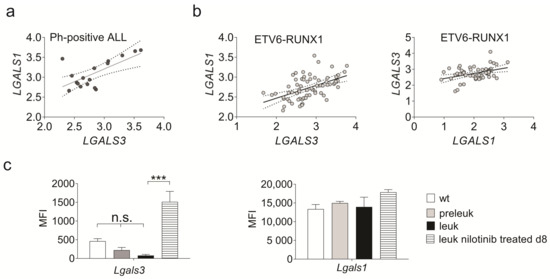 LGALS1 and LGALS3 mRNAs are co-expressed in human and mouse BCP-ALL cells. Positive correlation between log10 LGALS1 and LGALS3 mRNA expression in (a) human Ph-positive ALL samples (GSE79533) and (b) ETV6-RUNX1 ALL samples in two different arrays (left, GSE79533; right, GSE28497). Pearson correlation analysis, where dotted lines indicate the 95% confidence range of the best fit line. (c) Meta-analysis of GSE110104 for Galectin-3 (Lgals3) and Galectin-1 (Lgals1) gene expression in mouse B-cell precursor cells, flow sorted from bone marrows of control wild-type (wt) mice and pre-leukemic; fully leukemic (leuk); and leukemic, 75 mg/kg/d d8 nilotinib-treated BCR/ABL P190 transgenic mice. Each set consists of three biological replicates. *** p < 0.001. One-way ANOVA, Tukey’s multiple comparisons test. Right panel, no significant differences. MFI, mean fluorescent intensity.