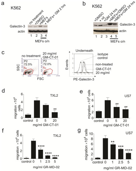 Interference of interaction of extracellular Galectin with leukemia cells by large inhibitory carbohydrates. (a,b) Western blot analysis of Galectin expression in K562 cells grown in suspension or co-cultured overnight with MEFs. Actin—loading control. (a) Treatment with 5 mg/mL GM-CT-01 (GM) for 2 h. (b) Treatment of cells with 1 μM nilotinib (nil) or 2 mg/mL GM-CT-01 for 24 h. (c) BCP-ALL cells in co-culture with OP9 cells were treated with 20 mg/mL GM-CT-01 for 2 h. BCP-ALL cells from underneath the stroma were assayed for cell surface expression of Galectin-3 using FACS: left, gating; right Galectin-3 cell-surface-positive cells in gate P2. Control, BCP-ALL cells underneath OP9 not treated with GM-CT-01. (d–g) Overnight migration of human BCP-ALL TXL2 (Ph-positive) or US7 (Ph-negative) to OP9 stromal cells plated in the bottom of Transwells in the absence or presence of the indicated concentrations of GM-CT-01 (d,e) or GR-MD-02 (f,g) ** p < 0.01, *** p < 0.001, **** p < 0.0001, one-way ANOVA, between 0 mg/mL compound and samples incubated with the indicated amounts of compound. Controls: only medium, no OP9 cells in the bottom well.