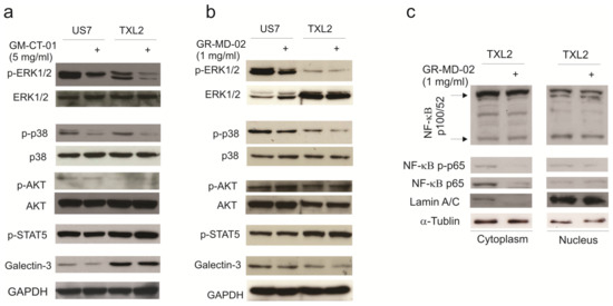We also analyzed if GM-CT-01 or GR-MD-02 treatment affects intracellular signaling. Figure 3a shows that a 3-day treatment with GM-CT-01 attenuated pErk1/2 signals in both US7 and TXL2 cells and also reduced endogenous levels of p-p38. GR-MD-02 (Figure 3b), similar to GM-CT-01, reduced the phosphorylation of p38 and Erk1/2, but Akt and STAT5 phosphorylation or cytoplasmic NF-kB p-p65 and NF-kB p65 levels were not clearly affected after long-term exposure to GR-MD-02 (Figure 3c).