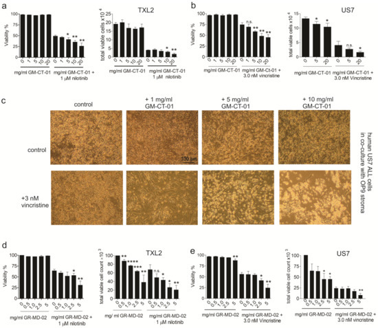 We then measured whether GM-CT-01 alone or in combination with therapeutic drugs affects the viability of BCP-ALL cells in the presence of OP9 stromal cells. As shown in Figure 4a,b, whereas GM-CT-01 alone had no obvious effect on TXL2 / US7 viability or cell proliferation, the addition of GM-CT-01 to nilotinib/vincristine-treated cells further decreased cell viability and cell numbers beyond mono-treatment. As shown in Figure 4c, consistent with these results, US-7OP9 co-cultures treated with different concentrations of GM-CT-01, or with vincristine as mono-treatment, were morphologically similar to controls, showing a mix of phase-bright and phase-dim leukemia cells on a background of elongated adherent stromal cells. However, treatment with both vincristine and 5 or 10 mg/mL GM-CT-01 was associated with increased numbers of de-adhered, phase bright leukemia cells in the media (Figure 4c).