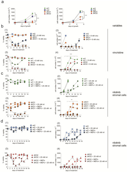 Cells were continuously treated with a non-lethal dose of vincristine, one component of the standard induction chemotherapy regimen for BCP-ALL. As shown in Figure 6b, wt2 or wt1 BCP-ALL cells treated with vincristine showed an initial drop in viability (panels (1) and (3)) but resumed proliferation (panels (2) and (4)) as the cells became resistant to the chemotherapy. However, the viability (panels (1) and (3)) of dKO2 or dKO1 BCP-ALL cells treated with vincristine did not recover after 4–5 days of drug exposure, and no cell growth (panels (2) and (4)) was measured.