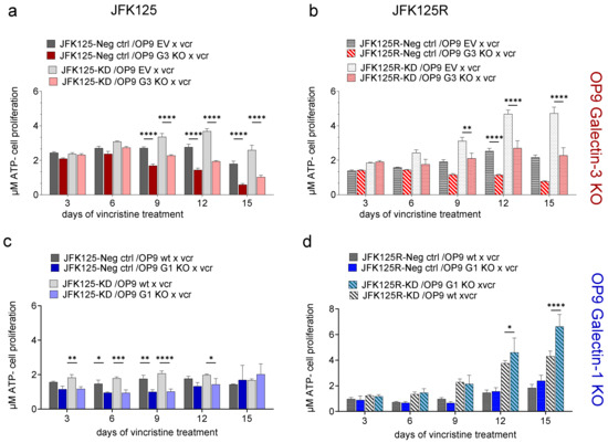 Reduced growth of human BCP-ALL leukemia cells in co-culture with OP9 Galectin-3 knockout but not Galectin-1 knockout cells when treated with 1.5 nM vincristine chemotherapy. ATP levels measured against a standard curve (CellTiterGlo assay, Promega). (a,c) JFK125 ST6GAL1 knockdown or negative control cells or (b,d) JFK125R ST6GAL1 knockdown or negative control cells [58] co-cultured for 15 days with OP9 Galectin-1 (G1) or Galectin-3 (G3) knockout cells. Two-way ANOVA, pair-wise comparisons only between matched BCP-ALLs on OP9 control versus OP9 KO cells. N = 4 samples per time point. Data for JFK125R NegC and KD on OP9 wt (NegC OP9) are from Zhang et al. [58] and are shown for comparison. Two-way ANOVA, Tukey’s multiple comparison test, adjusted p-values. * p < 0.05, ** p < 0.01, *** p < 0.001, **** p < 0.0001.