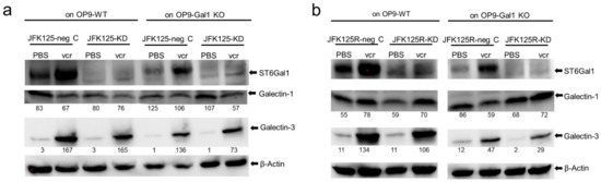 Drug-resistant JFK125 and JFK125R cells contain constant Galectin-1 with increased Galectin-3. JFK125 (a) or JFK125R (b) cells were harvested from co-cultures with OP9 wild-type (WT) or Galectin-1 knockout (KO) cells as indicated after treatment for 14 days with 1.5 nM vincristine or PBS. Antibodies used for Western blotting are indicated to the right and include ST6Gal1 (1:500), Galectin-3 (1:1000), Galectin-1 (1:1000), and β-actin (1:500, Santa Cruz); 4–20% SDS-PAA gradient gel; 1.6 × 106 cell equivalents loaded per well. Numbers below the Galectin-1 and Galectin-3 panels indicate the percentage of β-actin loading control signal in each lane by ImageJ quantification of shorter chemiluminescent exposures of the same Western blots.