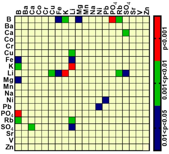 To ascertain whether the difference was genuine or merely a random fluctuation, further analysis is required. The two coefficients (before and after treatment on the same individuals) were compared by using a special adaptation of Fisher’s z-transformation [] that can be assumed to be normally distributed in such cases [] and is suitable for Spearman coefficients [,]. The two-sided p-values that resulted from the comparisons of all 190 pairs of elements were grouped into four categories: p < 0.001; 0.001 < p < 0.01; 0.01 < p < 0.05; p > 0.05, and these were plotted in the form of a standard categorical heat map by using GraphPad Prism v 8.4.2 (GraphPad Software, Inc., Sad Diego, CA, USA) and shown in Figure 1. As can be seen, 12 rs differences were found at p < 0.05, while the number expected by chance alone is 9–10. The two elements that showed the highest number of differences at p < 0.01 and p < 0.001 were Li and B. Interpretations of this analysis are further addressed in the discussion.