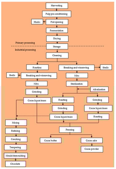 - Muñoz, M.S.; Cortina, J.R.; Vaillant, F.E.; Parra, S.E. An overview of the physical and biochemical transformation of cocoa seeds to beans and to chocolate: Flavor formation. Crit. Rev. Food Sci. Nutr. 2020, 60, 1593–1613. [Google Scholar] [CrossRef]