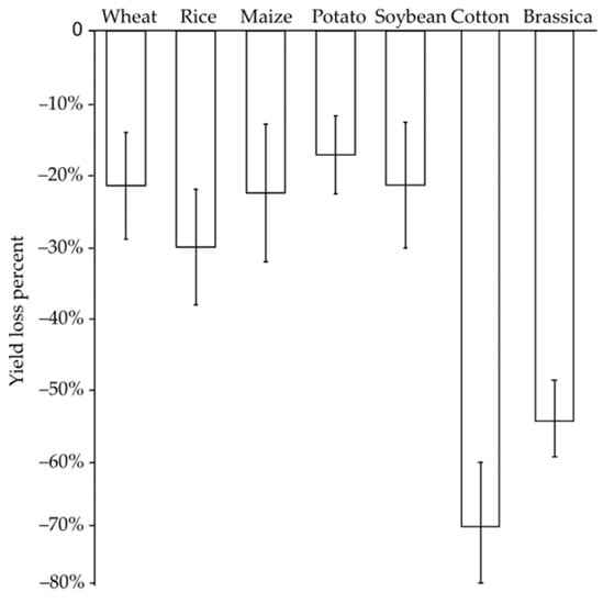 As sessile organisms, crop plants have to cope with other living organisms in their environment. Except for a few, such as rhizobia, which are beneficial to their hosts, most of the others cause some damage to crop plants such as pathogenic fungi, viruses, bacteria, herbivory insects, as well as parasitic nematodes. They are classified as biotic constraints to crop plants [,,,,]. Pathogenic fungi and bacteria are mostly intracellular pathogens. They invade different organs of the plant during the interaction with the host, live inside and kill the host cells using toxic enzymes or compounds such as necrotrophs or initially feed on plants parasitically as biotrophs or hemi-biotrophs, leading to vascular wilts, leaf spots, and cankers, among other symptoms [,]. Pathogenic viruses produce not only local lesions but also systemic damage that causes stunting, chlorosis, and malformations, although they rarely kill their hosts. They have a very efficient system of dissemination through vector transmission by insects, arthropods, and nematodes []. Herbivory insects, as well as mites, damage plants through feeding or egg-laying. Piercing–sucking insects can also act as virus vectors, transmitting them to plants through their styles [,]. Plant-parasitic nematodes attack the root system, withdraw the nutrients of plant cells, and alter plant development, physiology, and immunity, resulting in leaf necrosis and chlorosis, plant wilting, and stunting, and enhanced susceptibility to other pathogens [,,]. Several economically important genera parasitize various crop plants. The root-knot, root lesion, and cyst nematodes of Heteroderidae are the three most economically damaging genera of plant-parasitic nematodes and lead to significant yield loss []. In order to deal with these biotic stresses, plants have evolved an advanced immune system, such as physical barriers (waxes, thick cuticles, and specialized trichomes) to prevent pathogen settling and herbivory feeding, chemical compounds to protect against herbivory and pathogen infection, and immune responses that activate plant defense mechanisms in a much more effective way [,,,,]. However, these mechanisms cannot completely resist pathogen and herbivory damage, which still affect crop development and lead to a yield loss of 17–30% (Figure 1) and significant quality deterioration, and are irrefutably the most serious threat to worldwide food security [,,,,,]. In the Brassica crops, which can be invaded and fed by numerous pathogens and herbivory insects, the yield loss is estimated as high as 50–60% [,,].