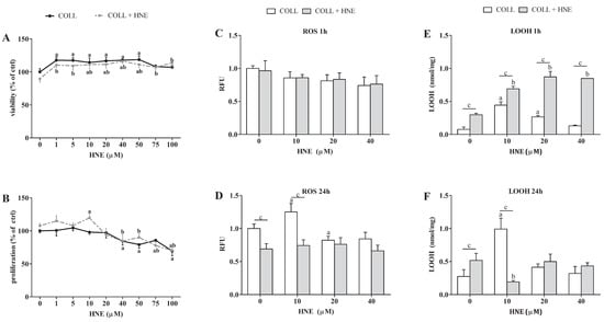 Sensitivity of RbE4 cells on HNE treatment on collagen (COLL) and collagen treated with 10 µM HNE (COLL + HNE). (A) Viability of RbE4 cells assessed by MTT assay after HNE treatment (0, 1, 5, 10, 20, 40, 50, 75, 100 µM) and represented as % of control. (B) Proliferation of RbE4 cells measured by 3H thymidine assay after HNE treatment (0, 1, 5, 10, 20, 40, 50, 75, 100 µM) and represented as % of control. ROS levels (C) 1 h and (D) 24 h after HNE treatment (0, 10, 20, 40 µM) represented in RFU (relative fluorescence unit). LOOH measured 1 h (E) and 24 h (F) after HNE treatment (0, 10, 20, 40 µM). All results are represented as mean ± SD, n = 12 samples in each group from 3 independent experiments. a—statistically significant in respect to control (0) on pure collagen, p < 0.001; b—statistically significant in respect to control (0) on modified collagen, p < 0.001; c—statistically significant between groups of same treatment, p < 0.001.