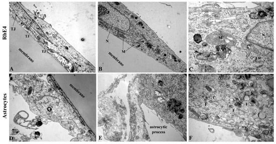 TEM pictures of RbE4 cells and astrocytes grown on cell culture inserts. (A–C) Endothelial RbE4 cells show characteristic oval shape with overlapping ends and pronounced tight junctions (TJ). (D–F) Astrocytes are bigger than RbE4 cells with less mitochondria (M), but with many caveolae (C), clathrine-coated vesicles (V) and bundled filaments (F). (N—nucleus; G—Golgi apparatus; ER—endoplasmatic reticulum). Magnification (A)—3000×; (B,D)—6000×; (C,E)—10,000×; (F)—12,000×.