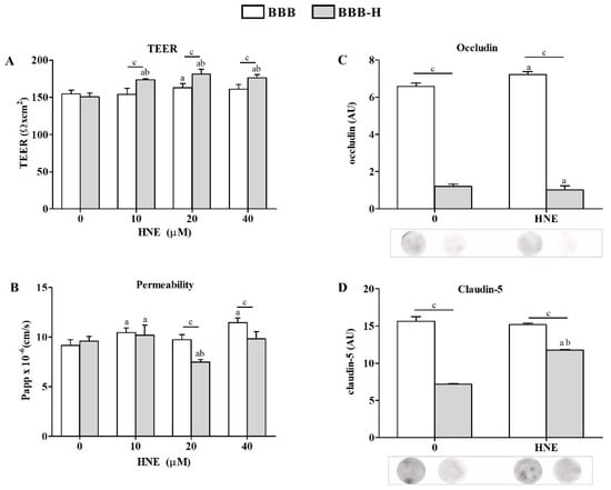 Markers of BBB integrity and permeability measured on BBB and BBB-H model. (A) TEER values of both models under HNE treatment (0, 10, 20, 40 µM). (B) Permeability of sodium fluorescein for both BBB models under HNE treatment (0, 10, 20, 40 µM). (C) Occludin and (D) claudin-5 changes in RbE4 cells of both BBB models at control conditions (0) and 20 µM HNE treatment, assessed by dot-blot. Signal intensities were analyzed with NIH ImageJ and represented as arbitrary units (AU). All results are represented as mean ± SD, n = 12 samples for each group from 4 independent experiments. a—statistically significant in respect to control (0) on pure collagen, p < 0.05; b—statistically significant in respect to control (0) on modified collagen, p < 0.01; c—statistically significant between groups of same treatment, p < 0.01.