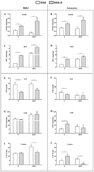 RbE4 and astrocytes in BBB and BBB-H models responded differently to HNE treatment. RbE4 cells in the BBB-H model showed higher concentrations of LOOH (p < 0.01) and of HNE-conjugates (p < 0.001) but lower Nrf2 expression (p < 0.001) than in the BBB model (Figure 4A,C,E). HNE treatment increased LOOH concentrations and HNE-conjugates in BBB-H RbE4 cells (p < 0.001). Even though LOOH decreased after HNE treatment in BBB RbE4 cells (p < 0.05), amounts of HNE-conjugates increased about four times (p < 0.001). Interestingly, GSH levels increased in Rbe4 cells of both models after HNE treatment, while CAT activity increased only in the BBB model after HNE treatment.