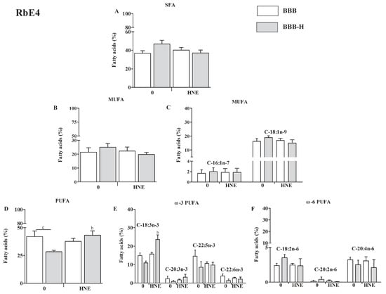 In RbE4 cells, neither SFA nor MUFA did not change significantly regardless of model or HNE treatment (Figure 5A,B). RbE4 cells had different PUFA levels in the two models, BBB and BBB-H, which was the cumulative effect of slight changes in individual PUFAs (p < 0.05, Figure 5D–F). HNE treatment increased PUFA levels in the BBB-H model (but did not cause changes in the BBB model), which was a reflection of a significant increase in C-18:3n-3 (ALA, α-linolenic acid, p < 0.05 Figure 5D,E). This increase resulted in a decreased ω6 to ω3 ratio in RbE4 cells of the BBB-H model treated with HNE (Figure A1A).