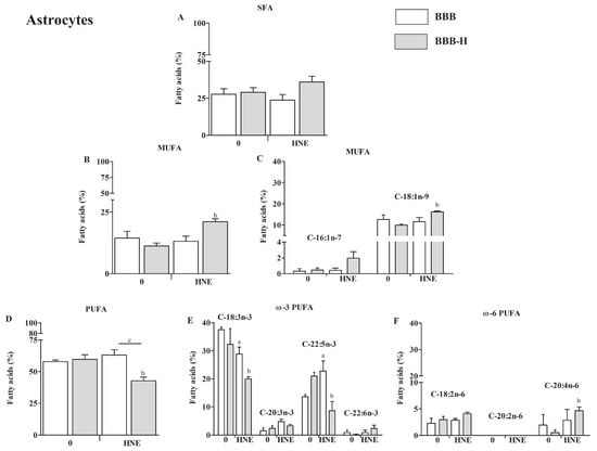 Fatty acid composition of RbE4 cells of BBB and BBB-H model at control conditions (0) and 20 µM HNE treatment based on the degree of saturation: saturated fatty acids (SFA) composition (A); monounsaturated fatty acids (MUFA) composition with major representatives (B,C); polyunsaturated fatty acids (PUFA) composition with major ω3 and ω6 representatives (D–F). All results are represented as mean ± SEM, n = 4 samples for each group from 2 independent experiments. b—statistically significant in respect to control (0) on modified collagen, p < 0.01; c—statistically significant between groups of same treatment, p < 0.01.
