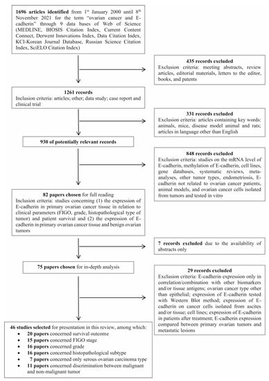 Initially, we found 1696 articles, from which we excluded meeting abstracts, review articles, editorial materials, letters to the editor, books, and patents. Thus, 1261 papers were left from the following records: articles, other, data studies, case reports, and clinical trials. In the next step, we excluded articles containing key words: animals, mice, disease model, animals, and rats. Finally, 989 articles remained. Ultimately, after exclusion of articles in languages other than English, we reviewed the titles and abstracts of 930 potentially relevant studies. During their analysis, the exclusion criteria covered studies on the mRNA level of E-cadherin, methylation of E-cadherin, cell lines, gene databases, systematic reviews, meta-analyses, other tumor types, endometriosis, E-cadherin not related to ovarian cancer patients, animal models, and ovarian cancer cells isolated from tumors and tested in vitro. We included studies concerning (1) the expression of E-cadherin in primary ovarian cancer tissue in relation to clinical parameters (FIGO, grade, histopathological type of tumor) and patient survival and (2) the expression of E-cadherin in primary ovarian cancer tissue and benign ovarian tumors. We chose 82 articles for full text reading. However, 7 of them were initially rejected due to the availability of abstracts only. Furthermore, after full-text reading and analysis, we chose 46 papers to present in this review. The excluded studies from the read of 75 records covered E-cadherin expression only in correlation/combination with other biomarkers and/or tissue antigens; ovarian cancer type other than epithelial; expression of E-cadherin tested with Western blot method; expression of E-cadherin on cancer cells isolated from ascites and/or tissue; cell lines; and expression of E-cadherin in patients after treatment. Moreover, we excluded three articles in which E-cadherin expression was compared between primary ovarian tumors and metastatic lesions. The detailed search strategy, with inclusion and exclusion criteria, is presented in Figure 1.