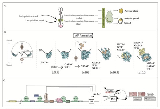 As previously mentioned, the adrenal cortex and the gonads arise from the thickening of the coelomic epithelium. However, the genesis of these organs is initiated at an earlier time point of embryonic development. Indeed, recent fate mapping studies have demonstrated that the coelomic epithelium could derive from the posterior intermediate mesoderm which emerges from the primitive streak [,]. In mice, it was demonstrated that mesenchymal cells originating from the early primitive streak (and subsequent early posterior intermediate mesoderm/coelomic epithelium) contribute to both the adrenal and the anterior gonad formation, while cells emerging from the late primitive streak (and subsequent late posterior intermediate mesoderm/coelomic epithelium) contribute solely to the gonad formation [] (Figure 1A). In humans and monkeys the adrenal and gonad arise from two distinct regions of the coelomic epithelium (anterior and posterior regions, respectively) [], suggesting that complete segregation of both tissues arises earlier in these species. Furthermore, it was suggested that a Hox gene code is involved in the anterior/posterior regionalization of the coelomic epithelium [,]. Finally, in the chicken, the adrenal gland seems to arise from the inner layer of the coelomic epithelium while the gonad arises from the outer layer []. This regionalization of the coelomic epithelium could explain the discrepancies observed following the inactivation of genes considered critical for the thickening of the coelomic epithelium and AGP formation. Indeed, while inactivation of Osr1 [] or Wt1 [,] leads to adrenal and gonadal agenesis (Table 2, list of mouse models), inactivation of Emx2 or Lhx9 leads to agenesis of the gonads without affecting adrenal development [,,].