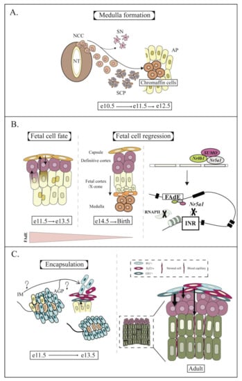 Key events in the late stages of fetal adrenal gland development and fate of the fetal adrenal cortex in mice: (A) Schematic model of medulla formation. Chromaffin cell differentiation requires the migration of a subpopulation of neural crest cells and their progressive differentiation into Schwann cell precursors and chromaffin cells. (B) Schematic model depicting the fate of the fetal adrenocortical cells. Before e14.5, adrenocortical fetal cells can differentiate into adrenocortical cells of the definitive cortex by first differentiating into capsular stem cells (or potentially by directly differentiating into cells of the definitive cortex), or they can proliferate and maintain the AP. After e14.5, cells from the AP do not contribute anymore to the definitive cortex formation. The progressive inactivation of Nr5a1 expression via NR5A1 SUMOylation and recruitment of NR0B1 to the FAdE leads to the regression of the fetal cortex/X-zone. (C) Schematics model for AP encapsulation. AP encapsulation requires the contribution of cells originating from both the fetal adrenal cortex and cells potentially originating directly from the AGP or the surrounding intermediate mesoderm. Different cell subpopulations have been identified including: Gli+ cells that are located the nearest to the adrenal cortex and that will eventually differentiate into steroidogenic cells of the definitive adrenal cortex; Wt1+ cells that have a more limited potential to differentiate into steroidogenic cells; and Tcf21+ cells that will differentiate into stromal cells of the definitive adrenal cortex. NCC = neural crest cells, NT = neural tube, SN = sympathetic neurons, SCP = Schwann cell precursors.