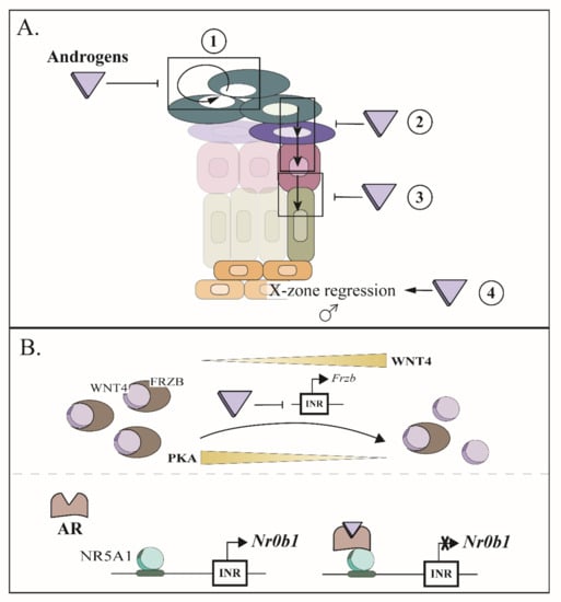 As previously stated, the adrenal gland of mouse is sexually dimorphic. Indeed, the adrenal glands of female have a higher weight than their male counterparts [,], which could be explained, in part, by the regression of the X-zone at puberty in male and its maintenance in female until the first gestation [,], and in part by the fact that the volume of the zF (but not the zG) is higher in females []. Furthermore, the higher volume of the zF was also associated with higher levels of circulating corticosterone []. Interestingly, it was shown that castration of mature male mice leads to the appearance of a secondary X-zone [], while testosterone treatment caused the rapid disappearance of the X-zone in females []. These findings demonstrate the key role played by male hormones in the adrenal cortex (Figure 4A).