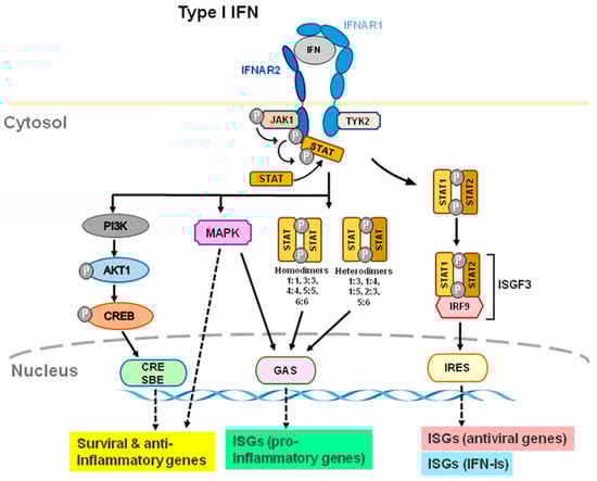 - Ivashkiv, L.B.; Donlin, L.T. Regulation of type I interferon responses. Nat. Rev. Immunol. 2014, 14, 36–49. [Google Scholar] [CrossRef] [PubMed]