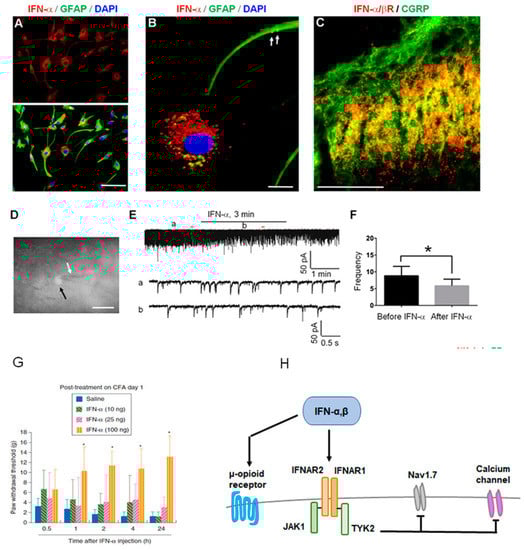 - Liu, C.C.; Gao, Y.J.; Luo, H.; Berta, T.; Xu, Z.Z.; Ji, R.R.; Tan, P.H. Interferon alpha inhibits spinal cord synaptic and nociceptive transmission via neuronal-glial interactions. Sci. Rep. 2016, 6, 34356. [Google Scholar] [CrossRef]