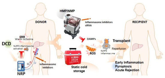 Inflammasome activation during LT. During transplantation surgery, liver IRI increases the rate of acute and chronic rejection and is estimated to be responsible for 10% of early organ failure. DCD has been increasing in recent years, attempting to alleviate the deficit in the number of available organs for transplantation. However, warm ischemia associated with the super-rapid recovery of DCD organs is related to higher NLRP3 activation compared with DBD donors. In this regard, the introduction of the NRP technique has reduced ischemic damage from DCD. Moreover, NRP could be used as the first line of inflammasome inhibitor drug delivery already in the donor. During cold ischemia storage, multiple ROS and DAMPs are released from damaged cells, and these molecules activate the NLRP3 inflammasome and ultimately pyroptosis during reperfusion, which have an impact in the inflammatory response during the early stage of acute rejection in liver transplantation. Recently, the introduction of the extracorporeal machine perfusion technique, HMP and NMP, has improved the liver transplant outcome by NLRP3 inflammasome inhibition during I/R. Furthermore, MP appears as a contrasted platform for the use of specific drugs or even siRNA delivery.