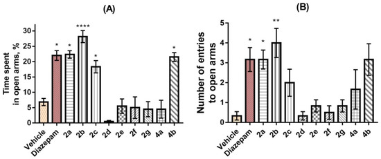 On average, the experimental mice spent 6.8 ± 1.2% of the time in the light arms of EPM in the control group and 22.0 ± 1.6% in the diazepam group. The tested compounds manifested various levels of anxiolytic activity. Under the action of compound 2d, the mice spent even less time in the illuminated areas than in the control group: only 0.5 ± 0.3%. The level of the effect of compounds 2e, 2f, 2g, 4a corresponded to the control values. The behavior of the mice under the influence of substances 2a and 4b was similar to the group of the comparison drug. Compound 2c also showed a significant reduction in stress behavior compared to the control group, although this was slightly below the level of diazepam and substances 2a and 4b. The highest level of effect in this case was registered for the compound under code 2b–28.2 ± 2.0%. According to the parameter of the number of entries of rodents into the open arms of EPM, a significant result was noted only under the influence of diazepam and compounds 2a (p < 0.05) and 2b (p < 0.01) (Figure 1).