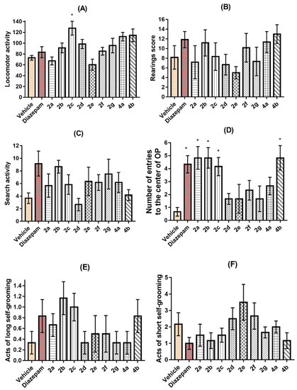 The number of squares crossed by rodents of the control group was approximately 73.3 ± 4.4, while in the diazepam group it was 83.5 ± 10.2. The parameter did not change significantly in all tested groups, with the exception of 2c, which was 127.7 ± 12.7 squares on average. There were also no significant changes in the rearings score, which is evidence of an absence of the muscle relaxant effects of the compounds under study. The number of holes examined by the mice (search activity) was higher in the rodents treated with diazepam (9.1 ± 2.0) than in the controls (3.6 ± 0.8); however, a significant difference was not registered. Under the influence of compound 2b, an increase in search activity was observed (8.6 ± 1.0), up to the level of diazepam, but also without significance when compared to the control values. In terms of the number of entries to the center of the open field, significant changes compared to the control group (0.6 ± 0.3) were registered in the mice treated with diazepam (4.3 ± 0.7) and compounds 2a (4.8 ± 0.9), 2b (4.8 ± 0.8), 2c (4.1 ± 0.7) and 4b (4.8 ± 0.9). The values for long and short self-grooming acts, which can be indirect parameters of calm and nervous conditions of animals, respectively, did not differ sufficiently to form conclusions (Figure 2).