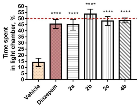 The light/dark box was used for testing the most active substances due to the results of the elevated plus maze and open field techniques. The mice administered with the vehicle spent 14.1 ± 3.4% of the observation time in the light chamber. This value increased sufficiently in the groups of the comparison drug (45.5 ± 3.7%) and compounds 2a (45.0 ± 4.4%), 2b (53.7 ± 4.1%), 2c (48.0 ± 3.6%) and 4b (48.5 ± 2.0%). Thus, all compounds under study with the highest values of anxiolytic activity confirmed their properties in terms of the light/dark box technique (Figure 3).